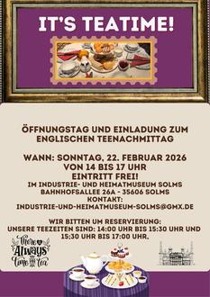 Das Industrie- und Heimatmuseum Solms lädt am Sonntag, dem 22.02.2026 wieder zu seinem beliebten englischen Teenachmittag ein. Inzwischen gehört dieser Nachmittag zu den charmanten Traditionen des Hauses - und auch diesmal dürfen sich die Gäste auf eine wunderbar britische Atmosphäre freuen.