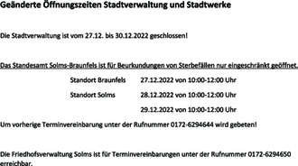 Die Friedhofsverwaltung Solms ist für Terminvereinbarungen unter der Rufnummer 0172-6294650 erreichbar.