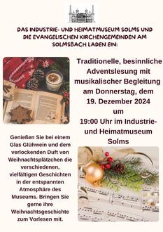 Der Arbeitskreis des Industrie- und Heimatmuseums Solms und die evangelischen Kirchengemeinden „Am Solmsbach“ laden auch in diesem Jahr wieder zu einer besinnlichen Adventslesung ins Solmser Heimatmuseum ein.