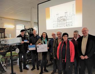 Die Mitglieder des Fördervereins Industrie- und Heimatmuseum hatten sich besondere Mühe gegeben, um die technischen Neuerungen für das Museum vorzuzeigen. Jörg Biemer baute den großen Beamer in der Halle extra zur Veranschaulichung auf. Holger Süß, als Vertreter der Stadt Solms, lobt das hohe ehrenamtliche Engagement des Vereins, welches ein Pfeiler des Industriemuseums sei und unverzichtbar in der Stadt und der Geschichte der Industriekultur. Regionalmanagerin Mercedes Bindhardt überreicht die Förderplakette an Jörg Ludwig und freut sich über die Beteiligung am Regionalbudget.