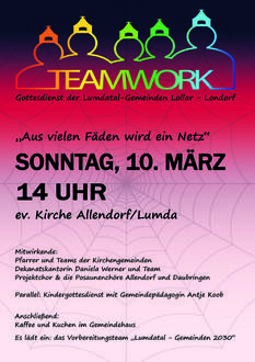 | 14 Uhr | Gottesdienst des Nachbarschaftsraumes in der ev. Kirche in Allendorf. Es laden ein: Die Pfarrer und Teams aus: Londorf, Allendorf, Treis, Staufenberg, Daubringen, Mainzlar, Lollar und Ruttershausen. Die musikalische Leitung hat Dekanatskantorin mit Team und dem Projektchor. Außerdem wirken der Posaunenchöre aus Allendorf und Daubringen mit. Wenn sie Teil des Projektchores sein möchten: Die einzige Probe findet statt am 10.03.24 von |