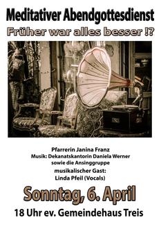 | 18 Uhr | Meditativer Abendgottesdienst „Früher war alles besser?“ mit Pfarrerin Janina Franz, Linda Pfeil (Gesang), Dekanatskantorin Daniela Werner und dem Gottesdienstteam. Die Kollekte ist bestimmt für den Fonds zur Förderung der Qualifizierung ehrenamtlicher Jugendlicher („Juleica“). |