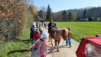 Bei Sonnenschein und Vogelgezwitscher machten sich alle Gruppen auf, um den Osterhasen zu finden. Begleitet wurden sie auf dem langen Weg zum Gelände des Motopädagogischen Vereins in der Nähe der Fischteiche von Kobold und Pauli, den beiden Ponys unserer Mitarbeiterin Tanja Mambour. Das Gelände dient uns als Naturraum, um mit den Kindern die Natur zu entdecken und Spaß an der frischen Luft zu haben.