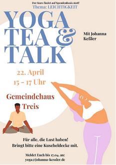 | 15:00 Uhr - 17:00 Uhr | Yoga Tea & Talk zum Thema „Leichtigkeit“ im Gemeindesaal auf Spendenbasis. |