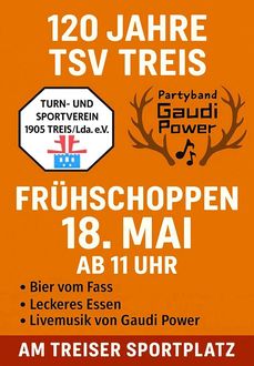 Am 18. Mai ab 11 Uhr laden wir euch herzlich zum Frühschoppen auf dem Treiser Sportplatz ein. Freut euch auf beste Stimmung mit der Partyband Gaudi Power, leckeres Essen von unserem Bidi und natürlich frisch gezapftes Bier vom Fass!