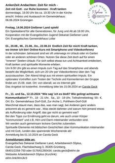 | 18 Uhr | Meditativer Abendgottesdienst „Verpasst“ mit Pfarrerin |