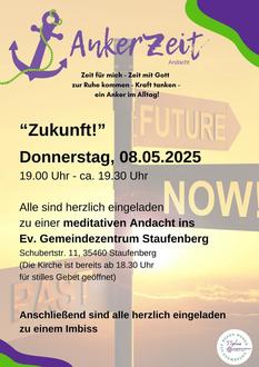 | 19:00 Uhr | Gemeindezentrum Staufenberg: Ankerzeit: Zukunft (s. Plakat) |