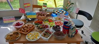 Es gab z. B. ungarische Langos, spanisches Tomatenbrot, ukrainische Hackfleisch-Reis Taschen, hessischen Schmierkuchen, englischen appel crumble, amerikanische Brownies, italienische Tomaten-Mozarellaspieße, türkische Zigarren-Börek, Treiser-Fleischwurst, selbstgemachte Marmeladen, selbstgemachtes Knäckebrot, Obstspieße, orientalisches Fladenbrot, Oliven-Feta Spieße u.v.m. Dazu hatten die Kinder zum Teil Flaggen ausgemalt, die dann ihr Essen markierten.