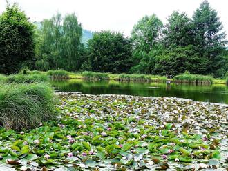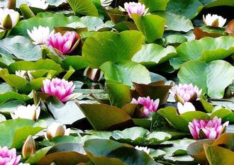 Blühende Seerosen in weiß und rot sind wieder zahlreich auf dem großen Teich des ASC in Treis zu sehen.