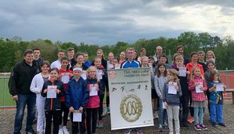 Ein Teil der Sportabzeichen-Absolventinnen und -Absolventen mit dem Stützpunktleiter Werner Just (Bildmitte) und dem 1. Vorsitzenden der TSG, Henning Schäfer (links).