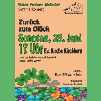 Unter dieses Motto stellt die Voice Factory des Gesangverein Mainzlar in diesem Jahr ihr Sommerkonzert am Sonntag, dem 29.6.2025 um 17:00 Uhr in der Kirche zu Kirchberg, 35457 Lollar. Der Chor singt deutsch- und englischsprachige Lieder über verschiedene Formen des Glücks, gepaart mit kurzen Texten und Gedichten. Was alles kann Glück sein? Wie wertvoll ist Glück? Mal nachdenklich und fordernd, mal lebensfroh und träumerisch erklingen die verschiedenen Melodien. Von deutschen Liedermachern wie zum Beispiel Udo Lindenberg, Max Raabe, Gregor Meyle und Basta oder Pop-Legenden wie Queen, John Lennon, Greg Gilpin hat der Chor unter Leitung von Daniela Werner ein buntes Programm zusammengestellt. Musik, die zum Nachdenken anregen, aber auch begeistern und froh machen soll. Für den Augenblick und für die Zukunft. Einlass zum Konzert ist 30 Minuten vor Beginn, im Anschluss an das Konzert gibt es noch Snacks und Getränke. Der Eintritt ist frei.