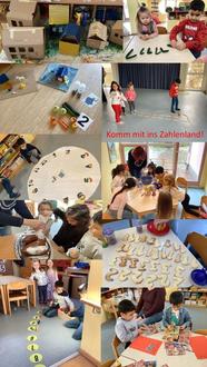 Im Januar 2025 startete die ROSA Gruppe mit dem Projekt „Komm mit ins Zahlenland“. Sechs Monate begaben sich die Kinder und zwei Erzieherinnen auf eine spielerische Entdeckungsreise in die Welt der Mathematik. Zu Beginn wurden fleißig Zahlenhäuser gebastelt. Alle zwei bis drei Wochen wurde eine neue Zahl erarbeitet. Zur Einleitung lauschten die Kinder jeweils einer lustigen Geschichte. Anschließend wurde das entsprechende Zahlenlied mit Klanghölzern gelernt. Viel Freude hatte die ROSA Gruppe auch bei den verschiedenen passenden Aktivitäten wie Zahlenplätzchen und Zahlenkuchen backen, Ziffern mit unterschiedlichen Materialien gestalten, interessante Spiele im Turnraum, lustige Fingerspiele und Lieder. Eine Zahlensuche im Haus und in der näheren Umgebung machte ihnen ebenfalls Spaß. Auch die jüngeren Kinder arbeiteten fleißig in ihren Zahlenbüchern. Nun geht das tolle Projekt zu Ende. Die Erzieherinnen freuen sich über die erfolgreiche Bildungsarbeit.