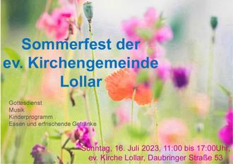 Mit einem Gottesdienst um 11 Uhr beginnt das diesjährige Sommerfest unserer Kirchengemeinde. Der Gottesdienst wird vom Kirchenchor, dem Frauenchor Cantamus und den „Schlagsaiten“ aus Alten-Buseck musikalisch mitgestaltet. Im Anschluss feiern wir im Pfarrgarten mit Steaks und Würstchen vom Grill, einem bunten Salatbuffet, erfrischenden Getränken, heißem Kaffee und hausgemachtem Kuchen, einem abwechslungsreichen Kinderprogramm und jeder Menge Musik. Wir freuen uns auf viele Besucher und ein fröhliches Beisammensein. Übrigens: wenn Sie einen Salat oder Kuchen zum Buffet beisteuern möchten, melden Sie sich bitte im Pfarrbüro (telefonisch unter 06406/1608 oder per mail unter kirchengemeinde.lollar@ekhn.de).