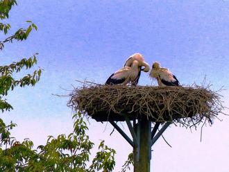 Die "Jugend" zeigt sich im Allendorfer Storchennest schon recht aktiv und wartet auf ihre nächste Mahlzeit, währenddem ein Altvogel auf einer hohen Laterne vom nahegelegenen Parkplatz eines Supermarktes Ausschau hält. (Aufnahmen aus der letzten Woche)