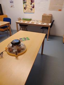 Am Tag 18 sind die Küken dann bei uns eingezogen und die Kinder sind in Kleingruppen und mit ihren Eltern und Großeltern im Projektraum gewesen und konnten das Schlüpfen und die Küken ganz nah beobachten. Es war eine große Freude zu sehen, wie viel Begeisterung das bei Alt und Jung ausgelöst hat. Die vielen Fragen, die auftauchten waren immer interessant und lehrreich! Bei einer konstanten Temperatur von 37,6C und 70% Luftfeuchtigkeit lagen die Eier bei uns im Brüter.