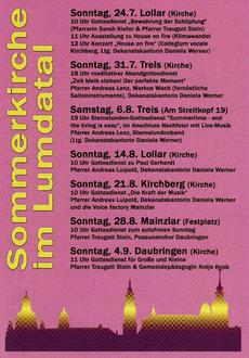 | 06.08.2022 (Samstag) | 19:00 Uhr | Sommerkirche: Treis, Am Streitkopf 19 |