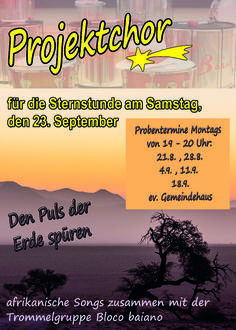 Am 23.9. feiern wir Sternstunde zum Thema „Den Puls der Erde spüren“. Die Trommelgruppe Bloco baiano wird Musik machen und für ein paar Songs wird ein Projektchor dazukommen, wozu Daniela Werner herzlich einlädt: die Proben finden statt immer Montags von 19 - 20 Uhr am: 21.8., 28.8., 4.9., 11.9., 18.9. Kommt einfach vorbei und lasst euch mit dem Rhythmus der Erde treiben.