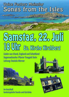Zum Auftakt der diesjährigen Sommerkirche im Lumdatal besingt der Chor Voice Factory Mainzlar unter der Leitung von Daniela Werner traditionelle Lieder aus England, Schottland und Irland. Im Konzert erklingen die unterschiedlichsten Rhythmen, mal tänzerisch und ausgelassen, mal sehnsuchtsvoll und andächtig. Es geht um Gott und die Welt, um Liebe, Trauer, die Seefahrt, Whiskey und Geselligkeit. Auch Jigs und Reels mit der irischen Tin whistle sind zu hören, Texte und Segenswünsche runden das Programm ab. Seien Sie zu Gast in der Kirche zu Kirchberg, die Voice Factory Mainzlar mit Chorleiterin Daniela Werner und Pfarrer Traugott Stein laden ein.