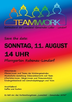 Besonders hinweisen möchten wir auf den Gottesdienst am 11. August um 14:00 Uhr im Pfarrgarten Rabenau-Londorf mit allen Gemeinden des unteren Lumdatals von Lollar bis Londorf und Ruttershausen. Im Anschluss erwartet Sie Kaffee und Kuchen. Ganz herzliche Einladung!
