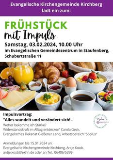 Frau Geck (Referentin Arbeitsbereich 55plus) hält einen Vortrag zum Thema „Alles wandelt und verändert sich - Woher bekomme ich Stärke?“. Das Frühstück wird vom Frauenkreis und den Montagsdamen der Kirchengemeinde Kirchberg ausgerichtet. Die Teilnahme ist kostenlos, es darf gerne gespendet werden.