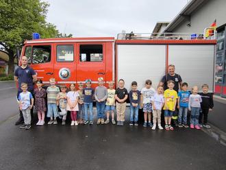 Der Juni stand auch unter dem Motto „Brandschutz“. Wir bekamen Besuch der Freiwilligen Feuerwehr Staufenberg, die uns über das richtige Verhalten im Falle eines Brandes informierte. Die Kinder hatten die Möglichkeit, einen Notruf abzusetzen und die Schutzausrüstung der Feuerwehr kennenzulernen. Bei unserem Gegenbesuch am nächsten Tag bekamen die Kinder auf eindrucksvolle Weise gezeigt, wie schnell Haare, Holz oder ein Kuscheltier brennt. Zum Abschluss durften alle Kinder ein Feuerwehrauto von innen bestaunen.