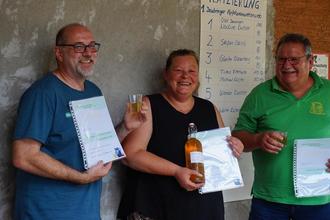 Pünktlich um 14 Uhr begann die Verkostung der mitgebrachten Apfelweine. Vier Helferinnen des Vereins kredenzten aus traditionellen Bembeln die Proben, sodass jeder Teilnehmer alle elf Weine kosten konnte - ohne zu wissen, welchen Wein er gerade probierte oder wann sein eigener an der Reihe war. Bewertet wurde nach Farbe, Duft und Geschmack, ganz im Sinne einer fairen und genussorientierten Bewertung.