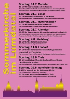 Auch dieses Jahr gehen die evangelischen Gemeinden des Lahn-/Lumdatals in den Sommerferien wieder auf Wanderschaft und wir besuchen uns reihum zu besonderen Gottesdiensten.