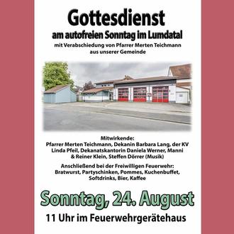 | 11 Uhr | Gottesdienst zum autofreien Sonntag bei der Feuerwehr mit Dekanin Barbara Lang, Pfarrer Merten Teichmann, Dekanatskantorin Daniela Werner und Linda Pfeil zusammen mit Musikern der Sternstundeband als musikalische Gäste. Die Kollekte ist bestimmt für die Jugendwerkstatt in Gießen. |