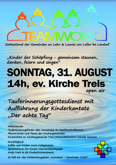 | 14 Uhr | Tauferinnerungsgottesdienst des Nachbarschaftsraums rund um die Kirche in Treis mit Pfarrpersonen Leissler, Luipold, Gräßel-Farnbauer und Teichmann, außerdem Dekanatskantorin Werner mit den Kinderchören und der Aufführung der Kinderkantate „Der achte Tag“. Im Anschluss gibt es Kaffee und Kuchen, Kaltgetränke und ein buntes Kinderprogramm organisiert von Gemeindepädagogin Antje Koob und den Kinderkirchenteams des Lumdatals. Herzliche Einladung! |