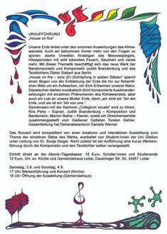 | 18:00 Uhr | Interaktive Ausstellung ‚Klimawandel’zu „House on Fire “ im Gemeindehaus Lollar; Studierende der Uni Gießen, Ltg. Dr. Sonja Geiger |