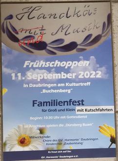 Am Sonntag, dem 11. September lädt die Harmonie zum Frühschoppen am Kulturtreff Buchenberg ein. Wir beginnen mit einem Gottesdienst um 10:30 Uhr in der Daubringer Kirche, der musikalisch von den Chören der Harmonie und dem Posaunenchor Daubringen begleitet wird.