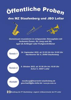 findet ebenfalls eine öffentliche Probe in den Räumen des Musikzugs Staufenberg, Hachborner Str. 6, in Mainzlar statt. Die Musiker beider Orchester proben und treten gemeinsam auf. Sie sind auch bei diesem Termin herzlich eingeladen.