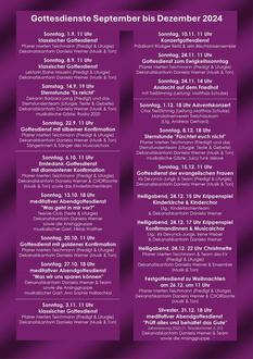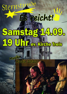 | 19 Uhr | „Sternstunde“ zum Thema „Es reicht“. Dekanin Barbara Lang (Predigt), das Sternstundenteam (Liturgie, Lesungen und Gebete) und Dekanatskantorin Daniela Werner (Ton) werden musikalisch unterstützt von der Band „Radio 2020“. Herzliche Einladung! |