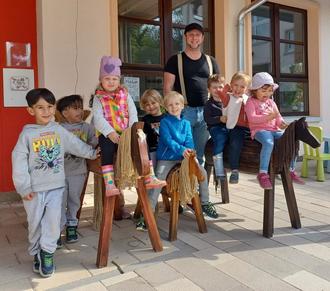 Nun waren sie wirklich sehr abgegriffen und hatten eine Auffrischung bitter nötig. Unser Kindergarten-Papa Florian Fuchs hat deshalb während der Ferien alle 3 Pferde mitgenommen und sie wieder schön gemacht! Da macht das Spielen jetzt doppelt Spaß!