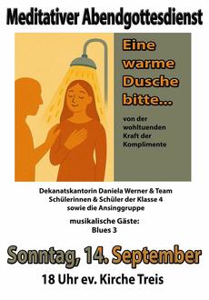 | 18 Uhr | Meditativer Abendgottesdienst zum Thema „Eine warme Dusche bitte! Von der wohltuenden Kraft der Komplimente.“ in der Kirche mit Dekanatskantorin Daniela Werner, dem Gottesdienstteam, Schülern und Schülerinnen der Klasse 4 und den musikalischen Gästen „Blues 3“. |