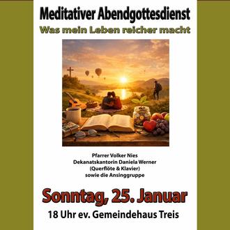 | 18:00 Uhr | Meditativer Abendgottesdienst im Gemeindehaus mit Pfarrer Volker Nies, Dekanatskantorin Daniela Werner und der Ansinggruppe. Die Kollekte ist bestimmt für das Bibelhaus Erlebnismuseum in Frankfurt. |