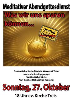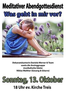 | 18 Uhr | Meditativer Abendgottesdienst in der Kirche zum Thema „Was geht in mir vor?“ mit dem Gottesdienstteam, der Ansinggruppe, Dekanatskantorin Daniela Werner und dem musikalischen Gast Niklas Walther (Gitarre und Gesang). |