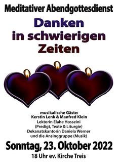 | 18:00 Uhr | Meditativer Abendgottesdienst mit Lektorin Elahe Hosseini & Team zum Thema: „Danken in schwierigen Zeiten“. |
