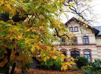 Der Herbst zeigt seine bunte Seite. So u.a. auch in Allendorf Lda. vor einem schönen historischen Bahnhofsgebäude am So. 29. Okt.