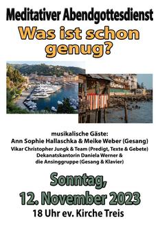 | 18 Uhr | Meditativer Abendgottesdienst zum Thema „Was ist schon genug?“ Pfarrer Christopher Jungk & Team (Predigt & Liturgie), Meike Weber & Ann-Sophie Hallaschka (Gesang), Dekanatskantorin Daniela Werner & Team (Musik & Ton) |