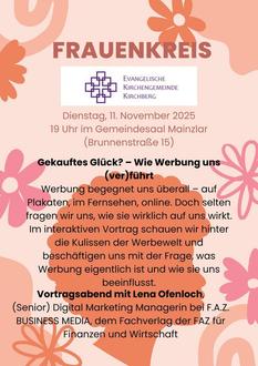 | 19:00 Uhr | Gemeindesaal Mainzlar: Frauenkreis (s. Plakat) |