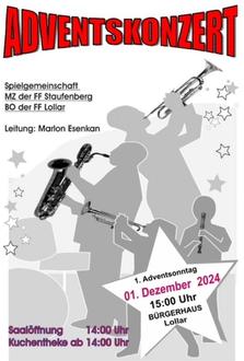 Die Musikerinnen und Musiker der Spielgemeinschaft des Jugend- & Blasorchesters der Freiwilligen Feuerwehr Lollar mit dem Musikzug der Freiwilligen Feuerwehr Staufenberg haben wieder ein abwechslungsreiches Programm zusammengestellt und freuen sich, ihrem Publikum mit ihren neuesten Stücken und bekannten Klassikern einen wunderschönen Nachmittag zu bereiten, und es auf den Advent einzustimmen.
