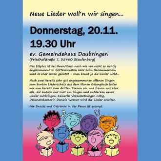 | 19:30 Uhr | Gemeindehaus Daubringen: Neue Lieder Singen (s. Plakat) |