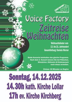 Und noch ein Hinweis auf die Weihnachtskonzerte der Voice Factory, am 3. Advent, dem 14.12.2025. Das erste Weihnachtskonzert, in diesem Jahr erstmalig gesungen um 14:30 Uhr in der katholischen Kirche Lollar. Das zweite Weihnachtskonzert um 17:00 Uhr in der Kirche Kirchberg. Die Voice Factory, der Chor des Gesangverein Mainzlar e.V. unter der Gesamtleitung von Daniela Werner, wird am 3. Advent auf eine musikalische Zeitreise gehen, mit Weihnachtsliedern vom 13. bis zum 21. Jahrhundert. Wir freuen uns auf zwei stimmungsvolle Konzerte.