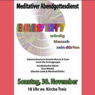 | 18:00 Uhr | Meditativer Abendgottesdienst zum Thema „Respekt - würdig Mensch sein dürfen“ mit Dekanatskantorin Daniela Werner & Team (Texte & Impulse, Gebete, Musik & Ton), der Ansinggruppe und den musikalischen Gästen: Duo Manké (Kerstin Lenk & Manni Klein Vocals, Sax&Piano) |