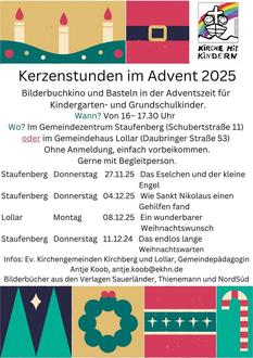 | 16:00 Uhr | Gemeindezentrum Staufenberg: Kerzenstunde (s. Hinweise) |