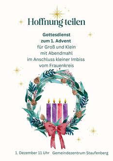 | 16:00 Uhr | Gemeindezentrum Staufenberg: Kerzenstunde (s. Hinweise) |