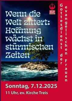 | 11:00 Uhr | Gottesdienst der evangelischen Frauen gestaltet vom Frauenausschuss unter der Leitung von Iris Devynck-Jungk und mit Dekanatskantorin Daniela Werner. Die Kollekte ist bestimmt für die Arbeit des Vereins der evangelischen Frauen in Hessen und Nassau, insbesondere im Bereich der Altersarmut und Einsamkeitsprävention. Mit Ihrer Spende werden besondere Angebote wie spirituelle Auszeiten, Frauen-, Seniorinnen- und Gruppenreisen gefördert. |