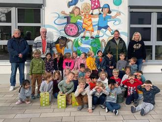 Jetzt war es soweit: unser Vorsitzender Herbert Becker übergab den fleißigen Kindern von Kindergarten und Schülerbetreuung den selbstgekelterten Apfelsaft.