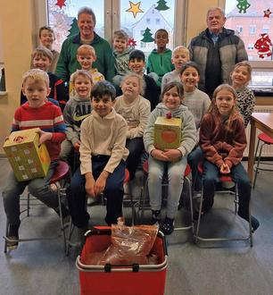 Im Herbst hatten die Kinder bei der Ernte und beim Keltern der Äpfel tatkräftig geholfen. Jetzt konnten sie die Früchte - nein den daraus gewonnen Saft ihrer Arbeit in Empfang nehmen.